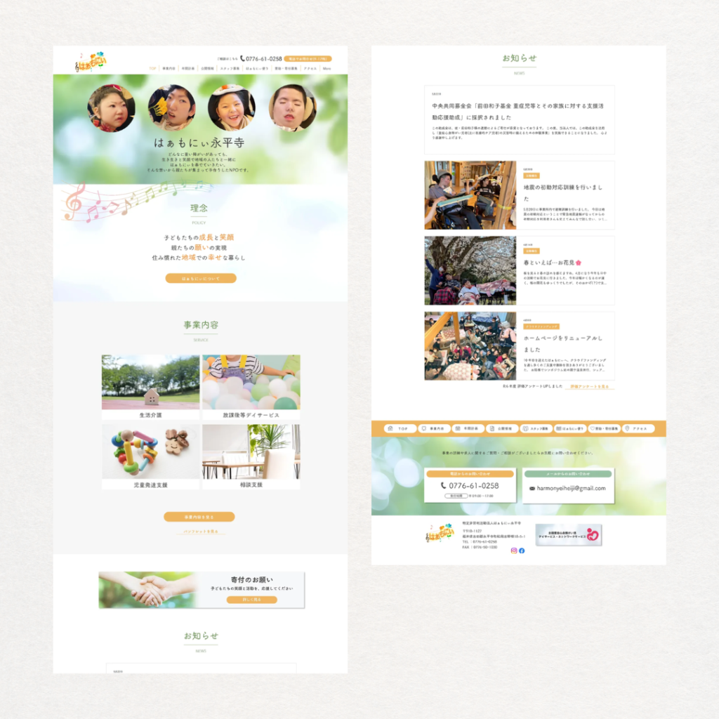 特定非営利活動法人はぁもにぃ永平寺様より、ホームページのリニューアルをご相談いただき作成しました。