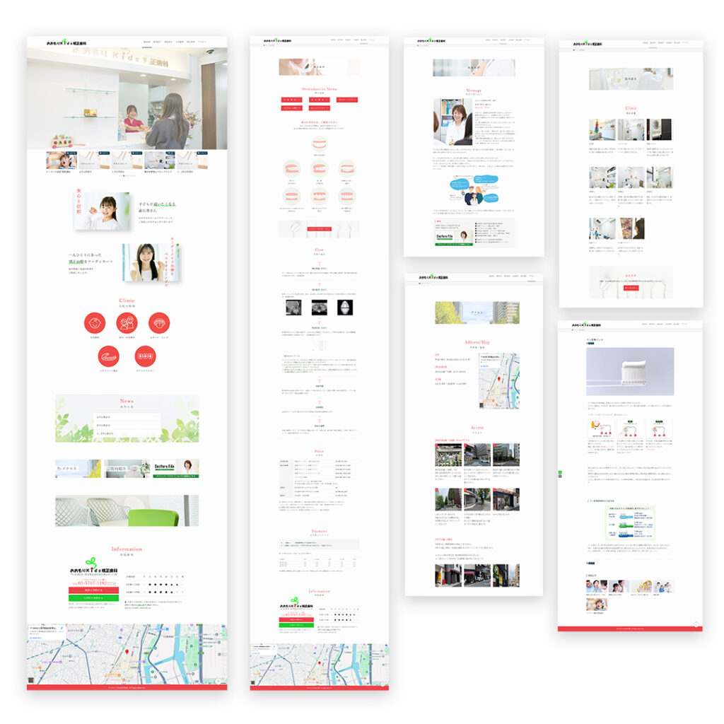 矯正歯科と小児歯科という特色を伝えつつ、爽やかで親しみのもてる優しい雰囲気を意識しました。ユーザー目線を大事に、分かりやすさと使いやすさを取り入れたデザインを心掛けました。料金や休診案内など、更新に関わる部分は管理しやすいようご提案しました。